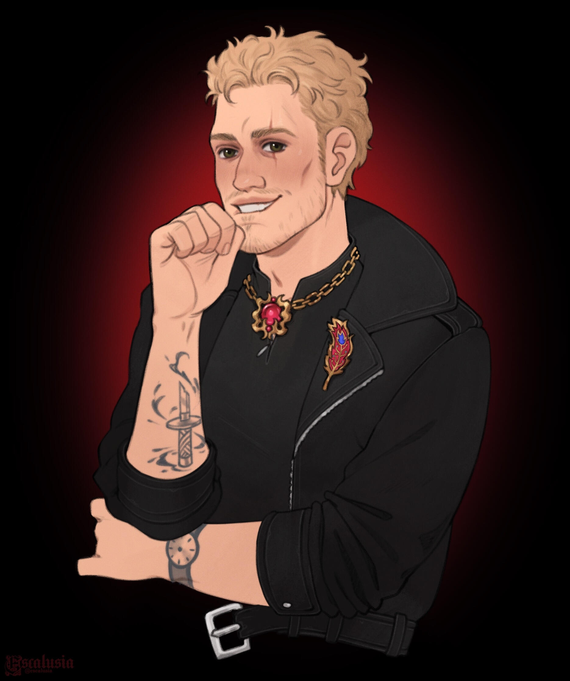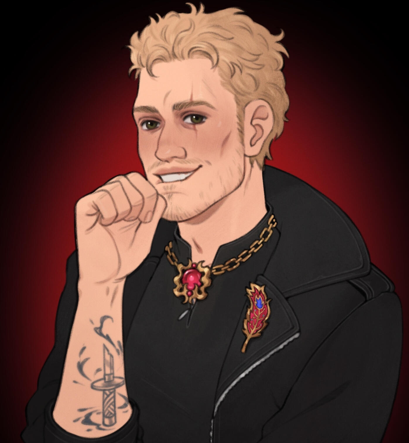 Sometimes: A tri-color phoenix feather pin on the lapel of his black leather jacket