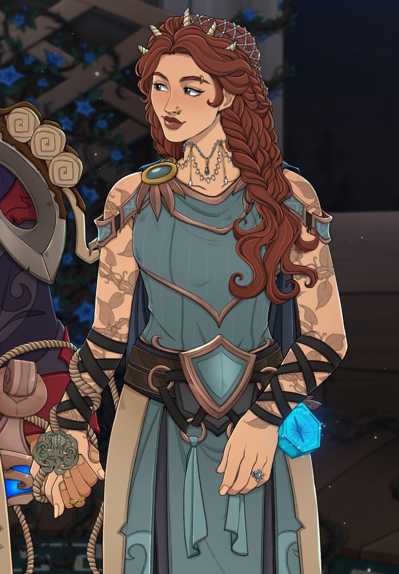 Always: A magic ruby flanked by cloud serpents on a gold chain. Also, silver keyring of skeleton keys and magic fire embers on his belt.