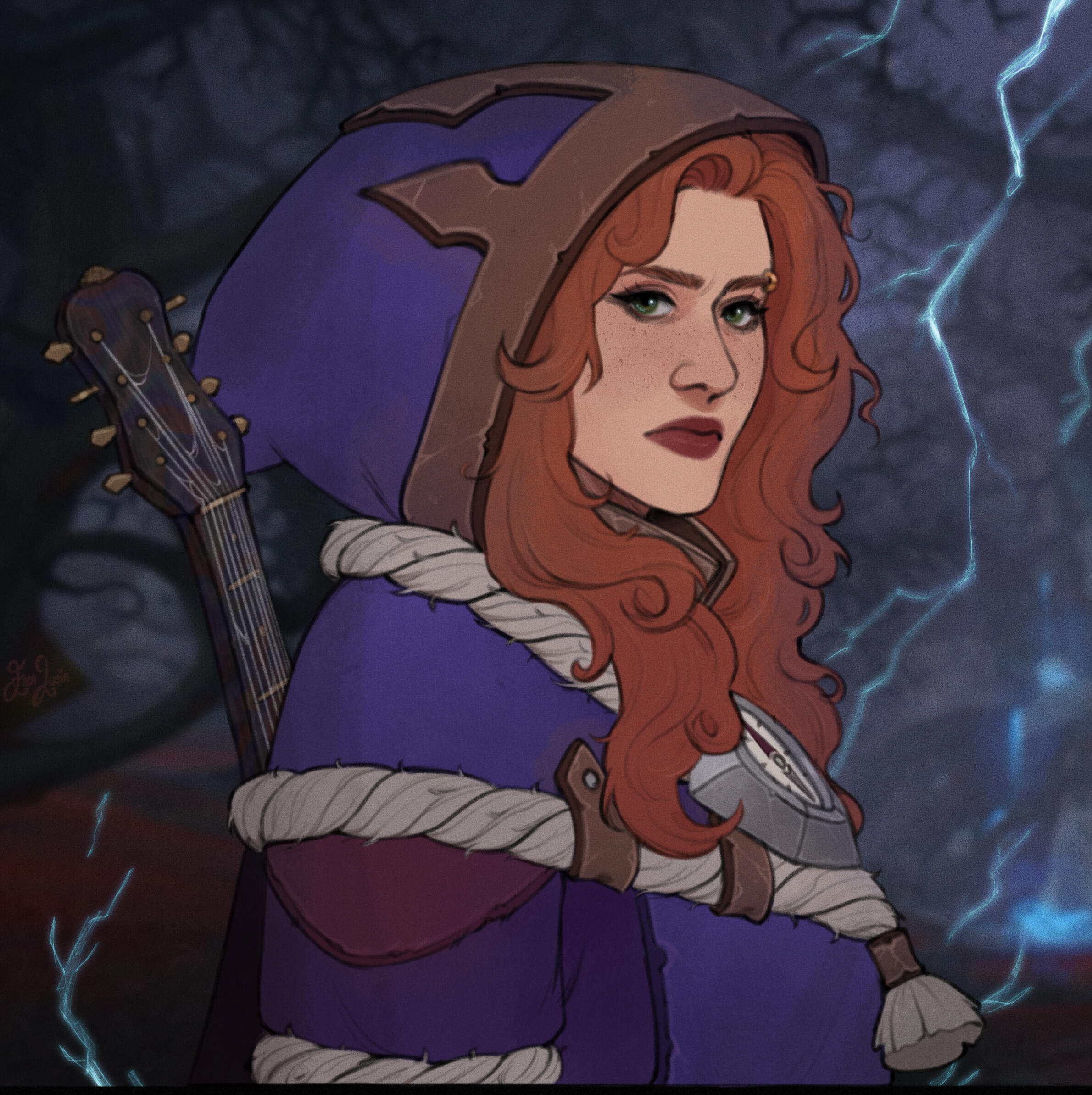 Hand crafted from a Blackwald tree with protective runes and thorned vines; this heirloom is dubbed the Lunalyre. In hidden places one can see strange runes which are not like those commonly used. It’s strung with delicate spider webs and close inspection reveals ethereal arachnids living in its hollow. It’s held on her back by a black strap with silver-threaded design of fish and sparrows. The mandolin radiates magic from the Tidemother, but its fabrication originates from fae magic.