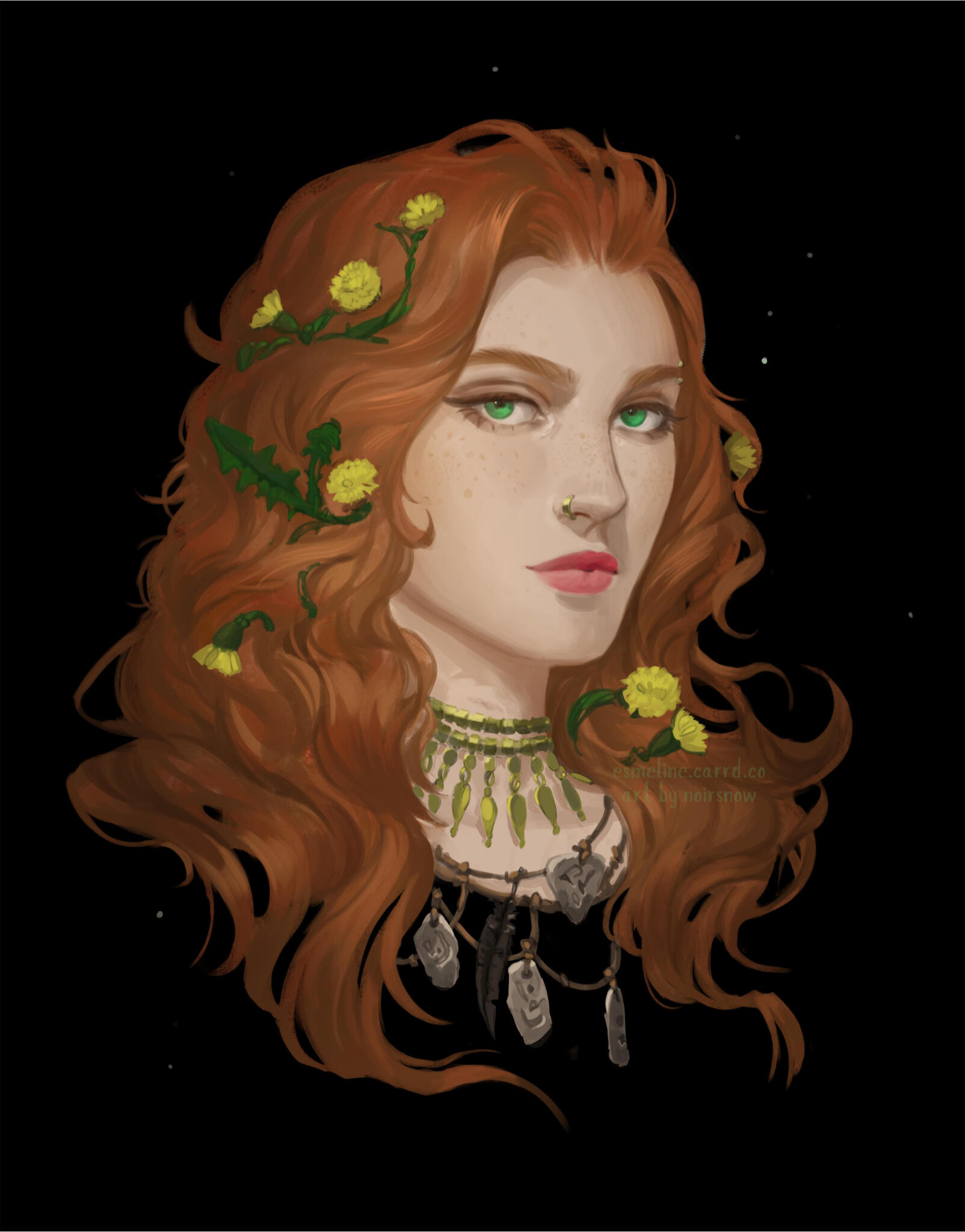 Always: Wearing various talismans of seashells, coins, and feather necklaces; one foxhead carved of wood
